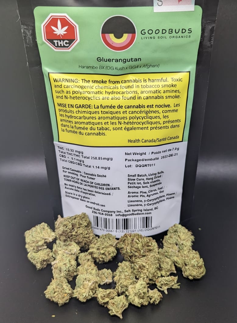 Gluerangutan is some sticky island dank. A back-cross of the popular legacy OG strain Harambe (OG Kush x GG4 x Hash Plant), Gluerangutan hits you with powerful diesel base aromas, followed by citrus zest overtones and a fresh mountain-pine finish. Dominant terpenes include Pinene, Limonene, and Caryophyllene. The top cut from a 100,000+ pheno hunt, Gluerangutan is ocean-grown next to the Salish Sea in living organic soils, harvested by hand, and hang-dried in small batches using artisanal slow-cure methods.