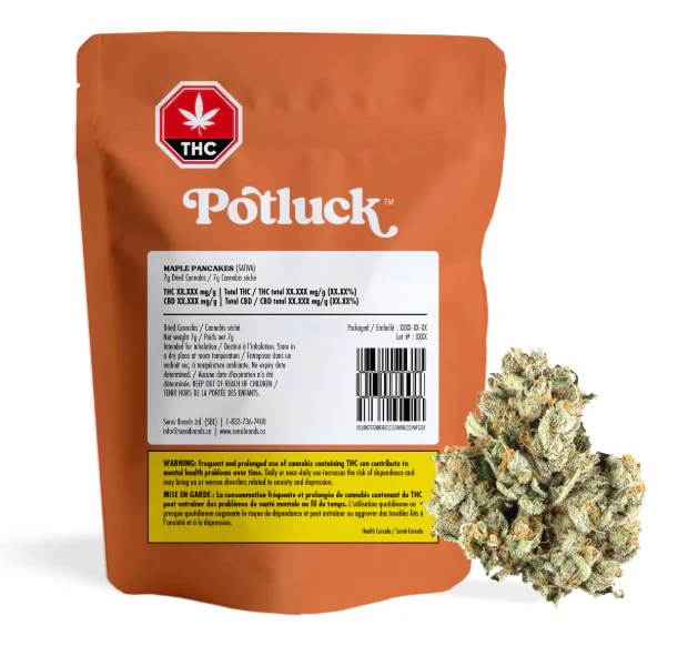 Maple Pancakes by Potluck brings on the flavour with a truly Canadian twist. This sativa-dominant strain is stacked with sweet, buttery aromas of maple syrup, layered with berry notes and pancake batter warmth—like brunch in a bowl. With high THC and flavour you can smell before the grind, Maple Pancakes is your go-to pick for wake-and-bakes, daytime sessions, or anytime you want to bring on the flavour.