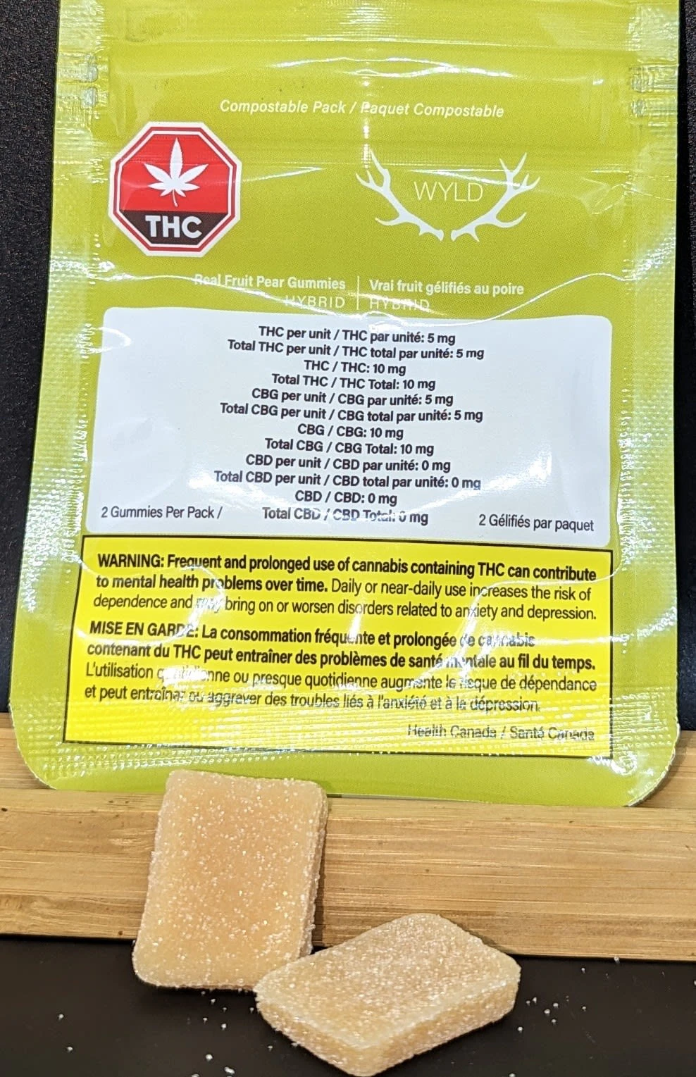 Wyld Pear Hybrid Enhanced THC:CBG gummies are a 1:1 product featuring a balanced dose of CBG. Made sustainably with real fruit, botanical terpenes, natural flavours and compostable packaging. 5mg THC and 5mg CBG per gummy, with two gummies per pack for a total of 10mg THC and 10mg CBG.